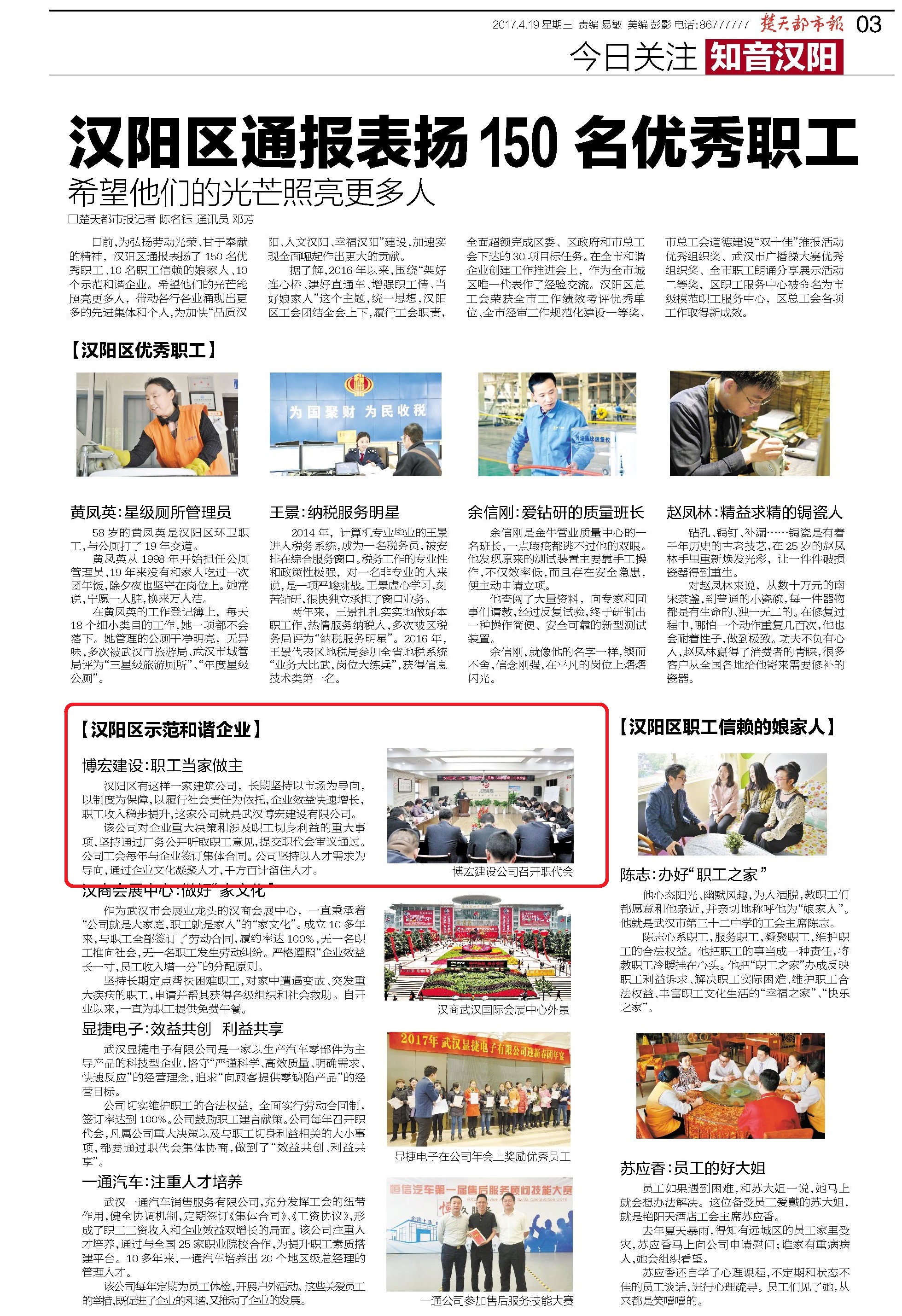 2017419日,楚天都市報(bào)知音漢陽(yáng)板塊報(bào)道了漢陽(yáng)區(qū)示范和諧企業(yè)獲獎(jiǎng)情況,其中我公司博宏建設(shè)名列首位。