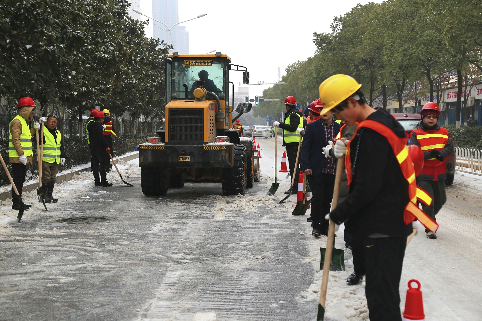 本次行動中公司出動人員160余人,正鏟車7臺,防凍手套、反光背心、礦泉水等物資一應俱全,董事長兼總經理錢濤親自帶隊指揮,領導班子集體出動來到一線參與除雪,部分干部職工更是不顧個人感冒的身體情況,堅持親自參與除雪,并駐守現場指揮調度。這次行動中,無論是老職工還是新員工,大家手腳齊用,人車并進,熱情高漲。氣溫雖寒,道路雖長,但架不住博宏建設廣大職工高漲的熱情與高效的作業,截止當天下午6點,琴臺大道全線單邊除雪基本完成,車輛通行無阻。