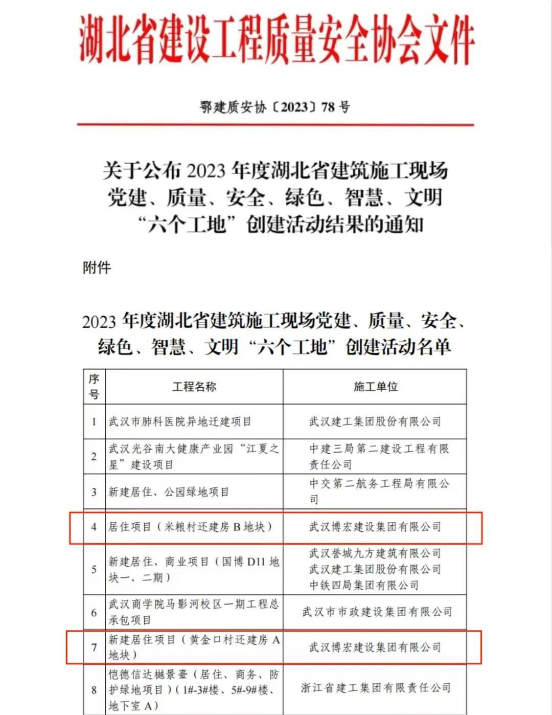 近日,湖北省建設(shè)工程質(zhì)量安全協(xié)會(huì)公布了2023年度湖北省建筑施工現(xiàn)場(chǎng)黨建、質(zhì)量、安全、綠色、智慧、文明“六個(gè)工地”評(píng)比結(jié)果名單,由博宏建設(shè)集團(tuán)承建的居住項(xiàng)目(米糧村還建房B地塊)、新建居住項(xiàng)目(黃金口村還建房A地塊)喜獲殊榮。