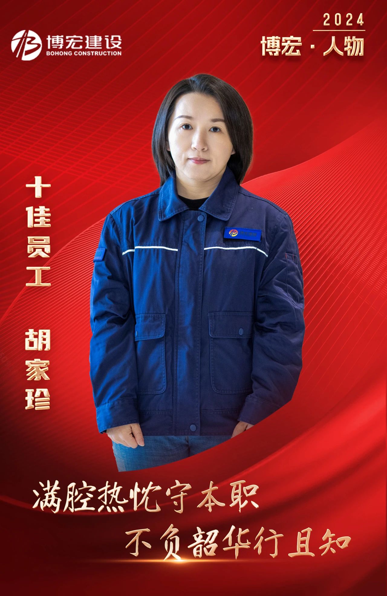 胡家珍,博宏建設集團五項目部資料主管,2019年3月入職博宏建設,先后參與建設武漢市第五醫院西院綜合大樓擴大片建設項目,新建居住、商業項目(月湖船院),新建居住、公共設施項目(新港臨江匯)(二標段)等多個項目。她個子不高,卻敢挑重擔,干凈利落的干事風格彰顯著她的豁達與干練,舉手投足間透露出自信灑脫,一絲不茍的工作態度讓她在一線發光發亮,入職博宏建設5年,連續獲得公司2020年度、2021年度、2022年度崗位能手,榮獲2023年度十佳員工,一項項榮譽是夢想照進現實的真實寫照,是默默堅守崗位接續奮斗的成果。